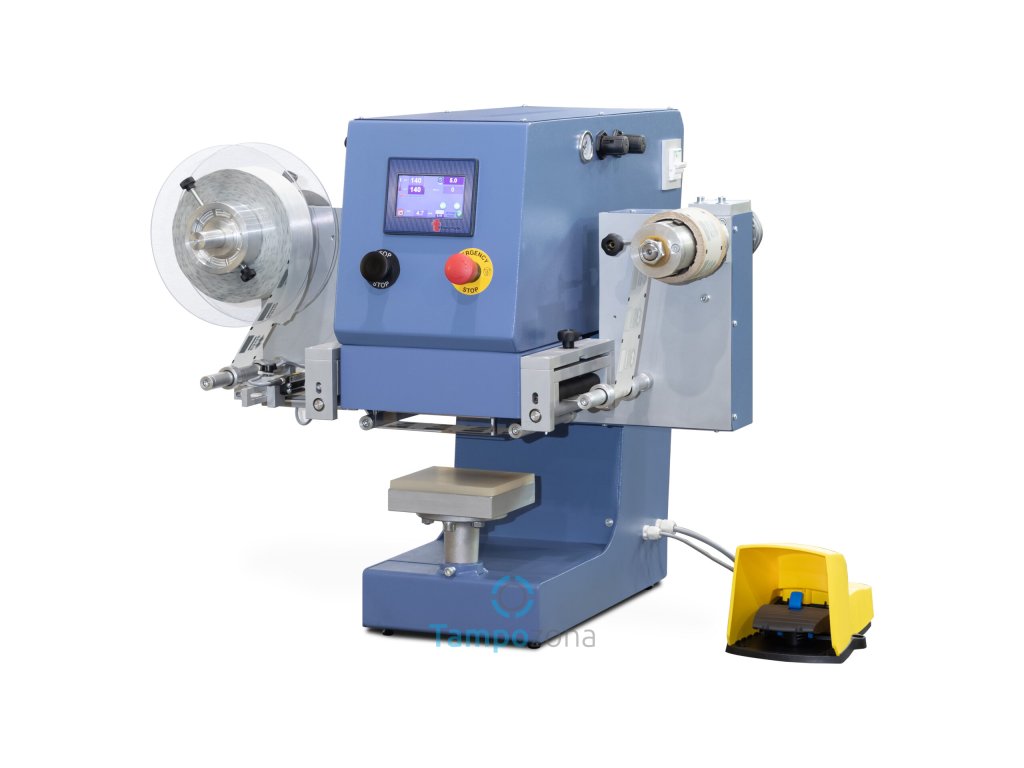 Pneumatický lis pro automatickou aplikaci fólie pro horkou ražbu a transferových etiket z role.