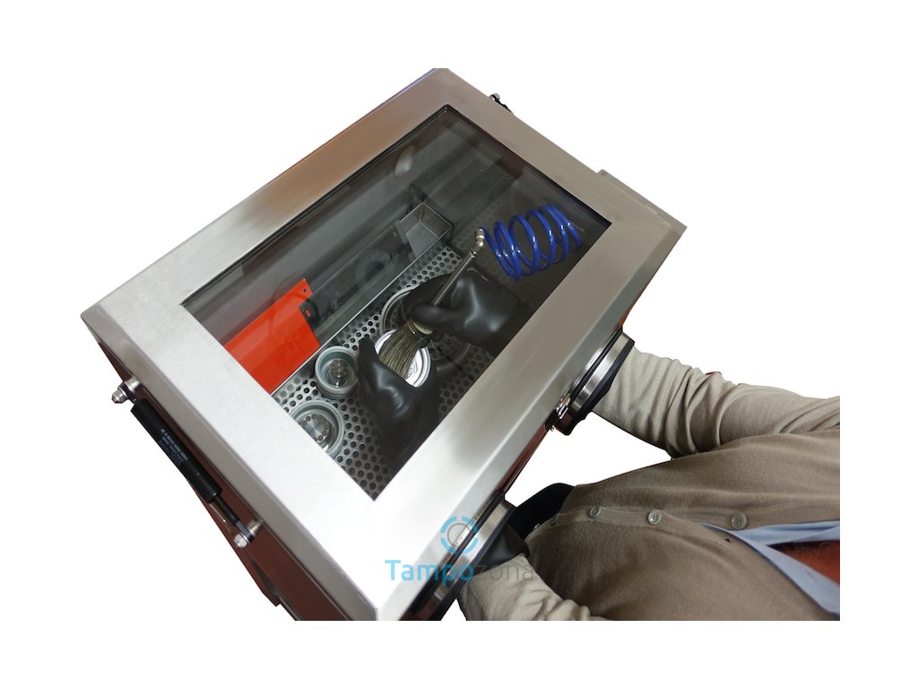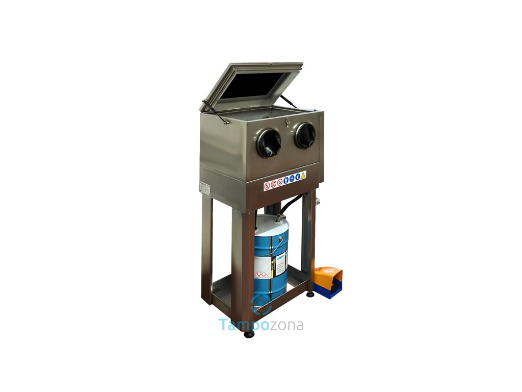 Manuální čistící box INOX 60M – jedná se o zařízení pro manuální očištění všeho příslušenství mezi nebo po tiskovém procesu. K manipulaci dochází v uzavřeném nerezovém boxu, kde se pomocí odolných rukavic a nylonového kartáče manuálně očistí věci od zbytků barev. Box je vybaven pneumatickou pumpou, která vhání čistící médium přímo do kartáče. Vypínaní a zapínaní pneumatické pumpy provádíme pomocí nožního spínače kdy čistící médium je čerpáno z 25 L nádoby, která je vložena dovnitř mycího boxu. Toto mycí zařízení oproti klasickému ručnímu čištění zvyšuje komfort, snižuje koncentraci zápachu a zkracuje čas čištění o polovinu.