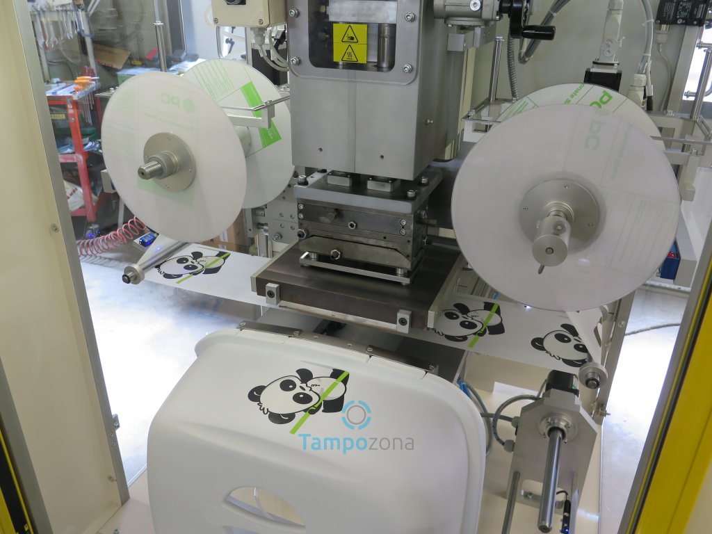 Stroj pro horkou ražbu v ploše s transferovou fólií.