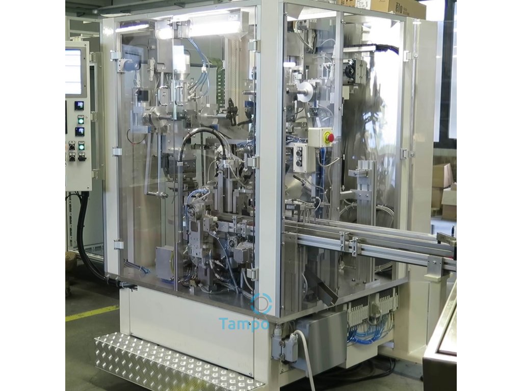 mechanický otočný stůl BETTINELLI se 4 stanicemi s osou nakloněnou pod úhlem 45° pro potisk zaoblených ploch