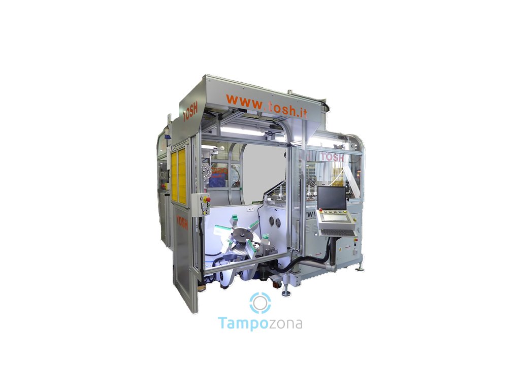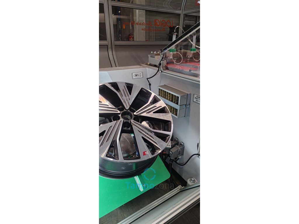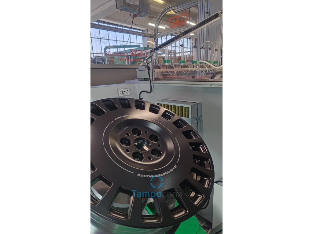 Stroj MK2 je určen speciálně k potisku hliníkových kol. 5 os tisku, 1 kamera na detekci ventilku a druhá kamera k detekci umístění potisků na kolo.